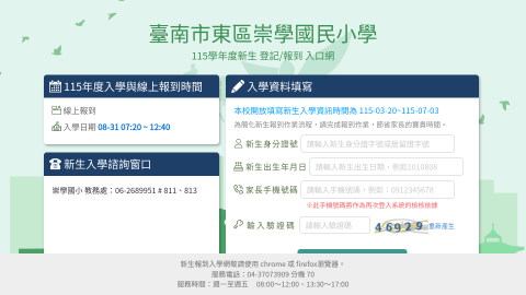 臺南市東區崇學國民小學115學年度新生登記/報到入口網