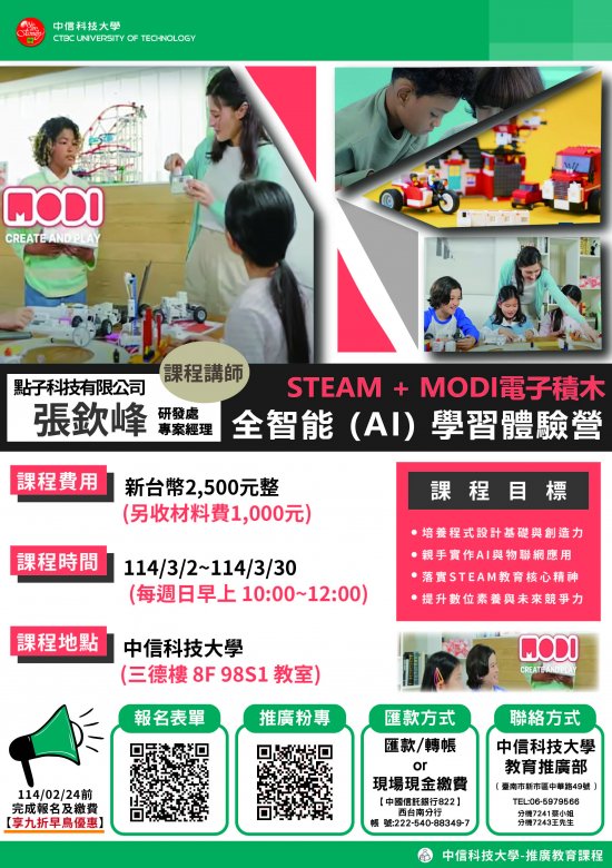為促進科技教育的普及與發展,本校推廣教育中心特規劃「[STEAM + MODI_電子積木] 全智能 (AI) 學習體驗營」,期望透過創新教學模式,提升學生在人工智慧、程式設計及跨領域學習方面的能力。本課程結合 MODI 電子積木與 Python 程式設計,透過動手實作與互動學習,讓學生在寓教於樂中掌握未來科技趨勢。