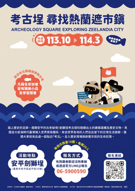 三、特展展出期間,另有額外開放各級學校及社區團體預約申請報名「考古埕-尋找熱蘭遮市鎮」導覽走讀行程,每個月限定 10 團,每團人數原則限定 25 人以內,若有超過每團限定人數請來電告知;如有報名參與意願,敬請掃描本函附件海報 QR-Code 加入特展官方 LINE 社群,或與協辦執行單位「傑森全球整合行銷」團隊聯繫,將有專人服務說明並協助後續事宜。(聯絡窗口:王先生;電話: 0972-011511 ;電子郵件:shuhaowang@liontravel.com )。