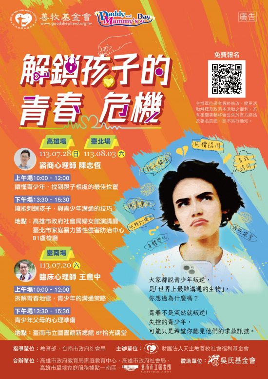 二、有鑑於近年來,「自殺」已躍升 15~24 歲青少年死因第 2 位,過去十年,台灣年輕人的心理困擾亦逐日驟增,青少年心理健康問題已然迫在眉睫,而父母是青少年心理健康的守門人之一,和諧的親子關係,將有助於減少青少年心理壓力。 113 年,第九屆善牧爸比媽咪節將以「解鎖孩子的青春危機」為題,邀請專業心理師陳志恆及王意中進行分享,期望協助
