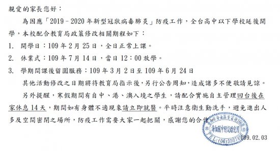 為因應「2019–2020年新型冠狀病毒肺炎」防疫工作,全台高中以下學校延後開學,本校配合教育局政策修改相關期程如下: