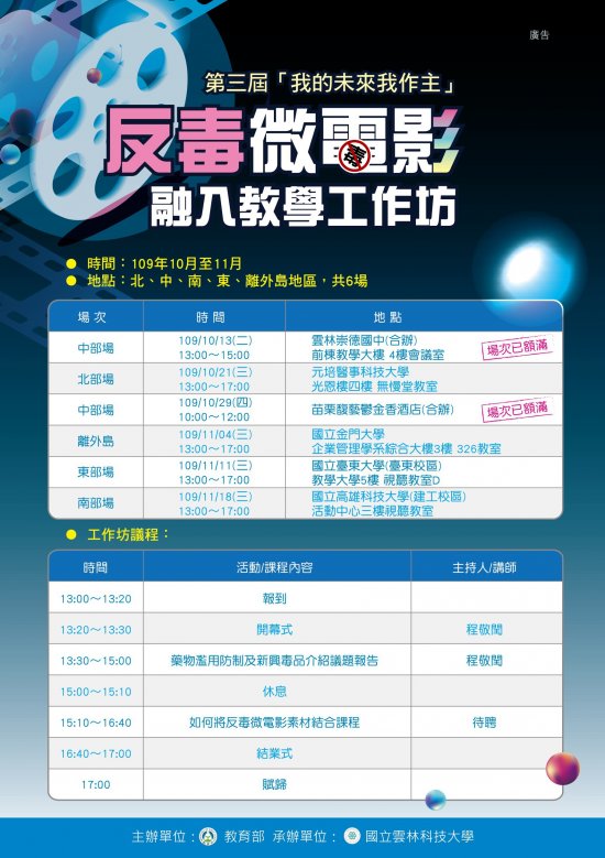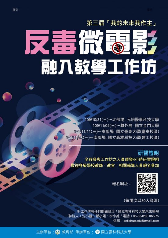 () 旨揭工作坊係為第三屆「我的未來我作主」反毒微電影競賽後續推廣活動,由雲林科技大學邀請國內藥物濫用防制、諮商輔導、媒體教學設計學者或實