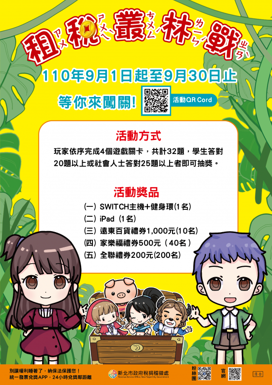 二、旨揭網路互動式遊戲玩家只要完成4個遊戲關卡,學生組答對20題以上或社會組答對25題以上者,就有機會參加抽獎,獎項有SWITCH+健身環、iPAD、遠東百貨禮券1,000元、家樂福禮券500元、全聯禮券200元,詳情請參閱本處FB「稅不著-呼叫暗光鳥」或活動網站 (https://titleschool.taxjungle.org.tw