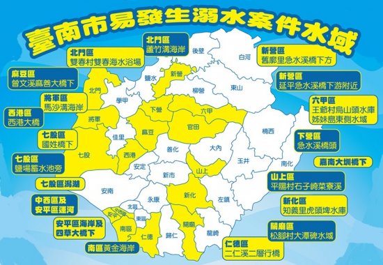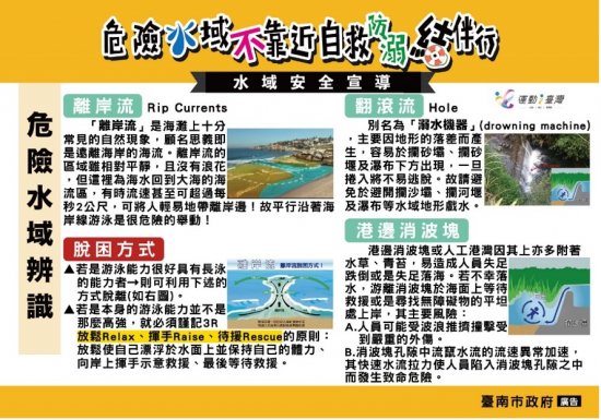 四、檢附「水域遊憩活動警示旗幟與水域安全標誌」、「臺南市易發生溺水事件之危險水域地區圖」及「水域安全宣導圖卡」供參。