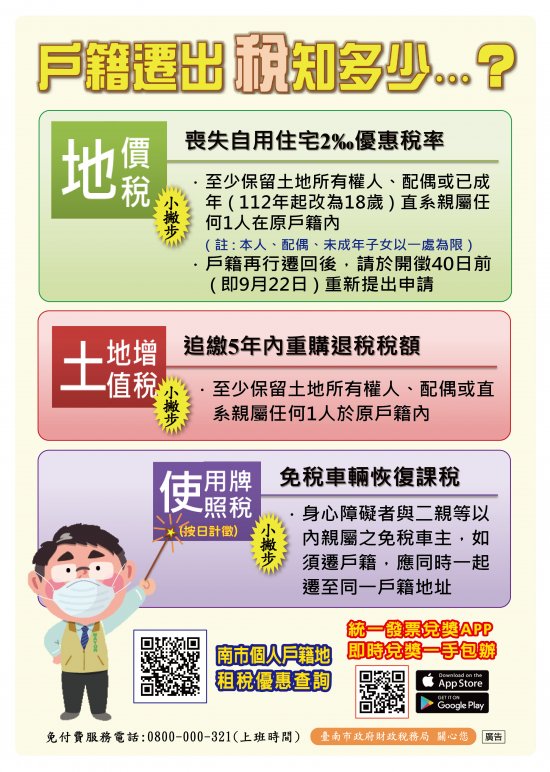 二、宣導內容:為方便民眾能即時查得目前戶籍地所享有之租稅優惠,於戶籍遷出前能審慎評估,避免因戶籍遷移而被追繳稅金,臺南市政府財政稅務局創新開發線上「南市個人戶籍地租稅優惠查詢」服務,請多加運用。