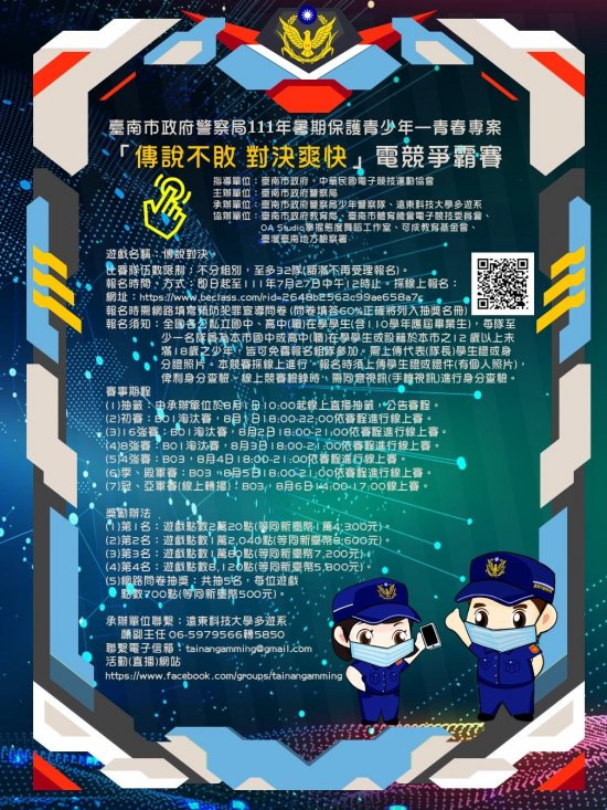 二、電競運動是政府明日產業發展之一項重要工作,為協助國中、高中(職)喜好電競學生建立良好的交流管道及跨領域學習能力,破除少年沉迷電玩世界之刻板印象,並結合犯罪預防宣導,特擴大辦理本次活動。