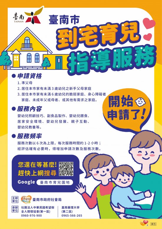 一、為提供兒童照顧支持服務,增強家庭教養及親職知能,確保兒童身心健全發展,社團法人中華民國希望樹全人關懷協會及嘉藥學校財團法人嘉南藥理大學辦理「112 年度育兒指導方案」,其內容含有到宅育兒指導及提升家長知能課程,確保本市有需求之 6 歲以下兒童及其家庭均能獲得專業的服務與協助。