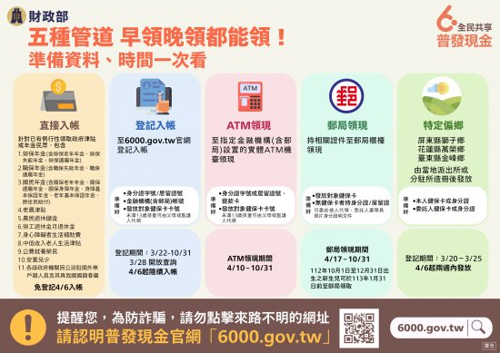 二、財政部為讓民眾即時取得普發現金正確資訊,避免遭詐騙,除透過新聞稿及記者會宣導外,並建置「全民共享普發現金」宣導網站及客服專線「1988」。又為加強宣導,再製作宣導影片、懶人包圖卡及電子傳單等宣導素材,電子檔已置於雲端(網址:https://drive.google.com/drive/folders/1n_4nvDbe5atXxQmNAsmTfwhp9uu1v1VW )供下載運用,期使民眾皆能充分瞭解普發現金如何領,並選擇最適合自己的方式領取。