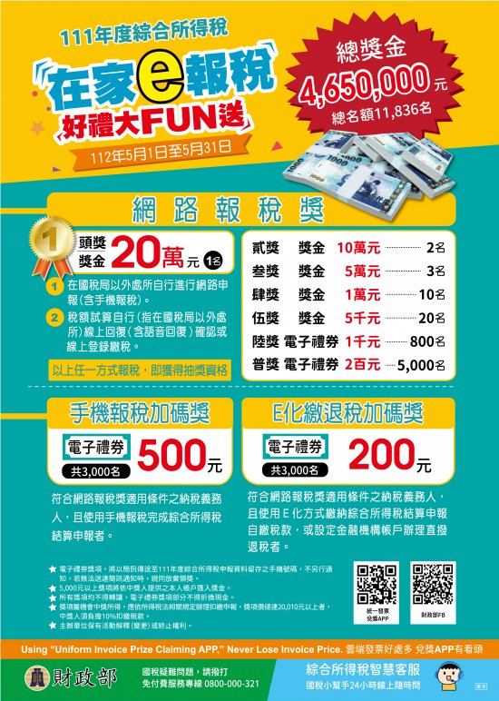 111年度綜合所得稅申報期開始囉!今年申報期間5月1日至5月31日,在家(指在國稅局以外處所)利用網路(或手機)申報綜合所得稅,最高可抽獎金20萬元,最方便又可抽大獎的報稅方式,當然是手機報稅,趕快去試試唷!