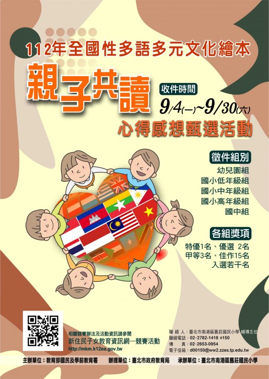 2.若學校統一報名請以學校為單位,統一將上述已簽名之授權同意書寄送臺北市南港區舊莊國小輔導室( 11572 臺北市南港區舊莊街一段 100 號),請載明報名「全國性多語多元文化繪本親子共讀心得感想甄選」。