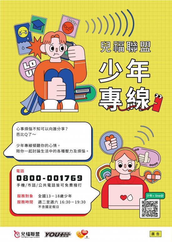 一、本會辦理「兒福聯盟-少年專線服務( 0800-001769 )」,提供全台 12 歲至 18 歲之少年免付費電話諮詢服務,服務時間為每週二至週六下午 4 : 30 至 7 : 30 。期待透過此專線傾聽少年的需求,協助其抒發壓力,並引導、陪伴他們面對和解決困難。