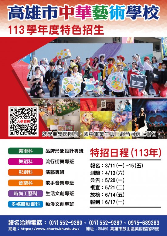二、本校 113 學年度特色招生將於 113 年 3 月 11 日至 3 月 15 日受理報名,招生科班計有美術科、多媒體動畫科、時尚工藝科、影劇科、音樂科及舞蹈科,相關資訊詳見招生 DM(如附件)。