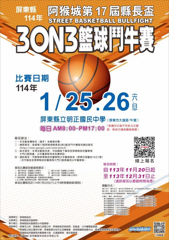 主旨:轉知屏東縣政府警察局辦理青少年大型預防犯罪活動「屏東縣 114 年第 17 屆阿猴城縣長盃 3 對 3 籃球鬥牛賽」實施計畫、報名表及活動海報 1 份,請查照。