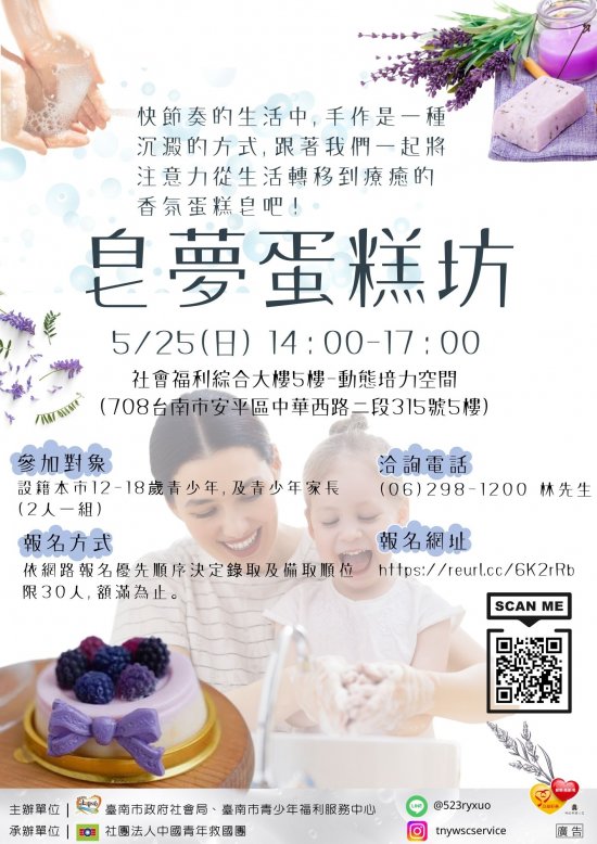 二、跑馬燈播放文字如下:親子手作「皂」蛋糕,臺南青少中心邀請您一起發揮想像力,創造專屬療癒小物,詳洽 06-2981200 。