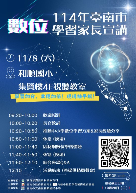 四、活動海報請參閱附件,如有報名問題,請洽本市教育局數位學習推動辦公室謝老師 06-2130669#480 。