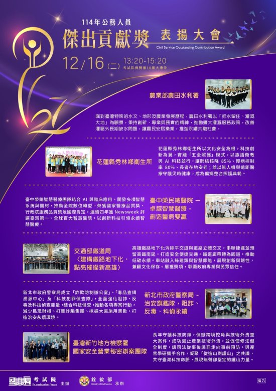 二、檢附原函影本及「114 年公務人員傑出貢獻獎表揚大會」個人獎及團體獎電子海報各 1 份,。又該電子海報檔案業置於銓敘部全球資訊網( http://www.mocs.gov.tw/) 公告資訊/傑出貢獻獎/最新消息,歡迎自行下載運用。