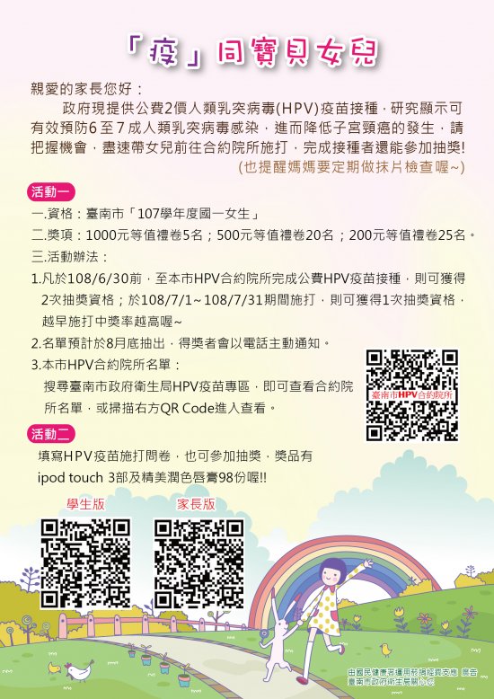 說明: 一、依據本府衛生局 108 年 6 月 11 日南市衛國健字第 1080101544 號函辦理。 二、旨揭目的提醒家長盡速帶家中國一女生前往本市合約院所施打公費 HPV 疫苗,並鼓勵媽媽定期做子宮頸抹片檢查,以期降低本市子宮頸癌發生率。 三、 HPV 單張夾附對象:本市「107 學年度國一女生」。 四、 HPV 單張內容如附件,該局預計於近期內配送至各校。
