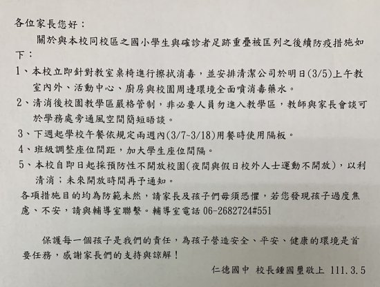 3/5開始調整本校防疫措施請親師生攜手防疫守護健康!