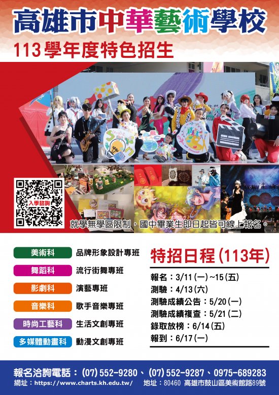 二、本校113學年度特色招生將於113年3月11日至3月15日受 理報名,招生科班計有美術科、多媒體動畫科、時尚工藝 科、影劇科、音樂科及舞蹈科,相關資訊詳見招生DM(如附 件)。