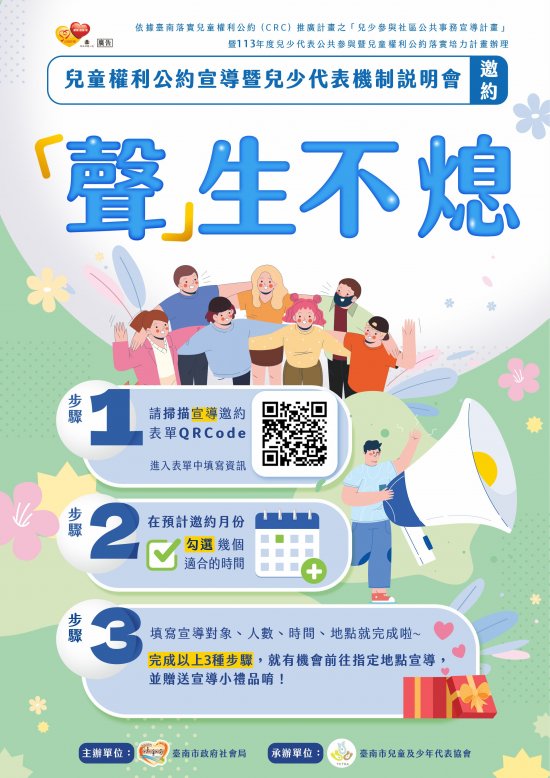 轉知:臺南市政府社會局辦理『聲』生不熄──兒童權利公約宣導暨兒少代表機制說明會