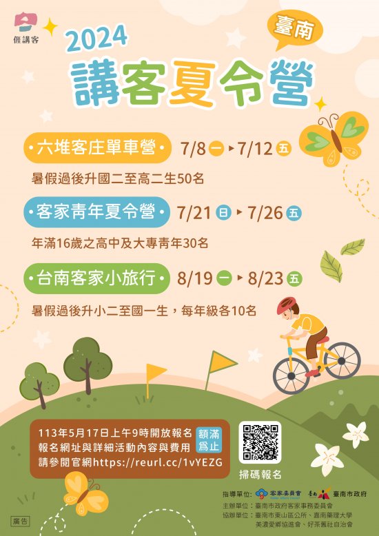 轉知:市府辦理「2024臺南講客夏令營—『青少年單車 營』、『台南客家小旅行』、『客家青年夏令營』」活動