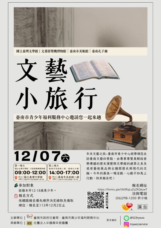 轉知:臺南市政府社會局辦理青少年福利服務中心「文藝小旅行」育樂活動計畫