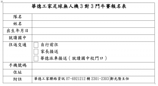 1、報名表(如附件)。2、電話: 07-6921212 轉 2301-2303 。