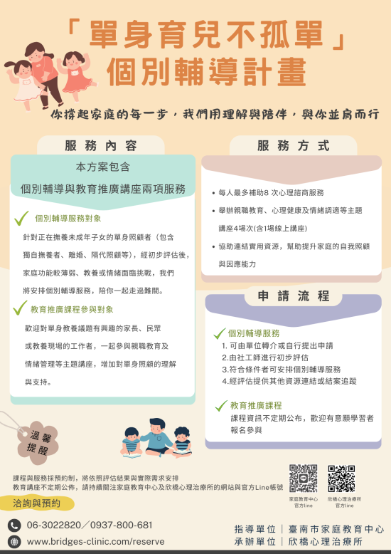 臺南市家庭教育中心委託欣橋心理治療所辦理「單身育兒不孤單」個別輔導計畫