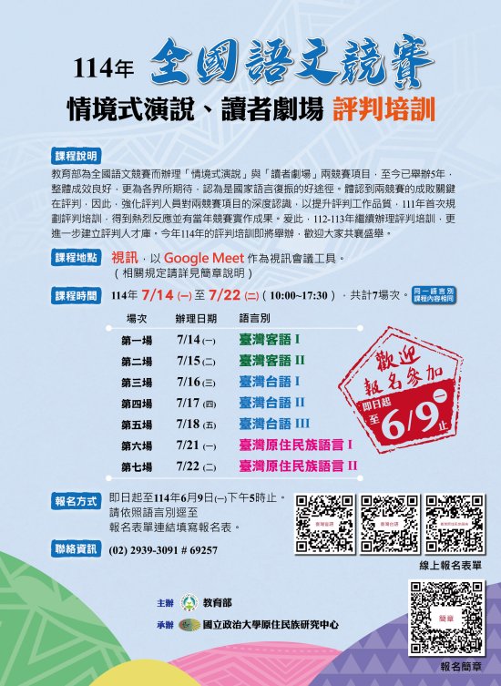 二、教育部為強化全國語文競賽評判人員對情境式演說、讀者劇場競賽的掌握,提升評判工作品質,委請國立政治大學辦理情境式演說評判、讀者劇場人才培訓。