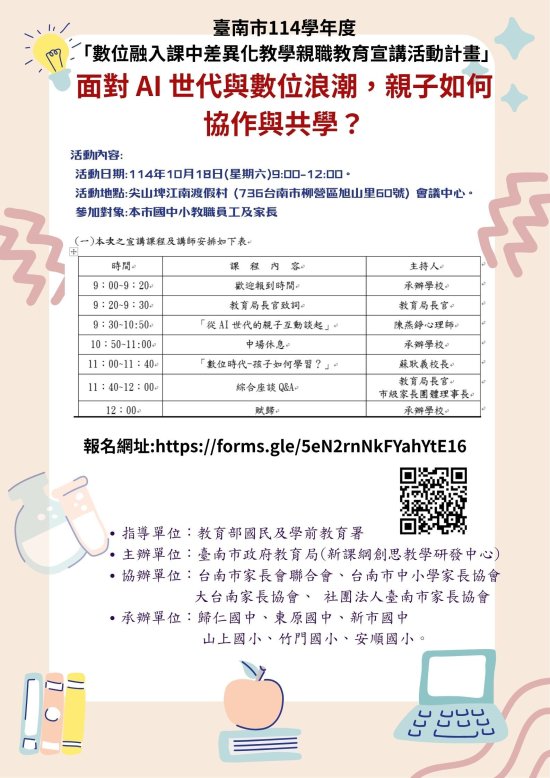 二、為提高本市家長及教職員工對於國中小辦理「數位融入課中差異化教學暨社會情緒管理」課程規劃與設計措施之瞭解,特聘請 SEE Learning 陳燕錚心理師及山上國小蘇耿義校長擔任本次親職教育講座提供親師協力與溝通技巧、優化學生學習創新。