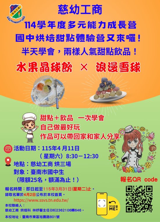 六、本校聯絡人:慈幼工商烘焙科林妤馨主任(06)2362106 轉 646 。