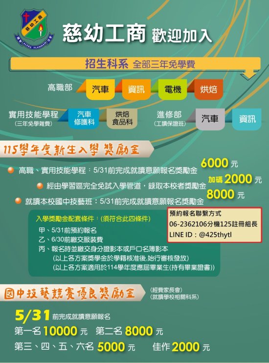 四、(一)學生、家長或國中端老師如對簡章或集體報名有任何疑問或需要協助,歡迎聯絡本校註冊組組長。(二)聯絡方式: 1.電話:06-2362106轉125 2.信箱:ds120@mail.ssvs.tn.edu.tw 3.LINE官方帳號:@425thytl