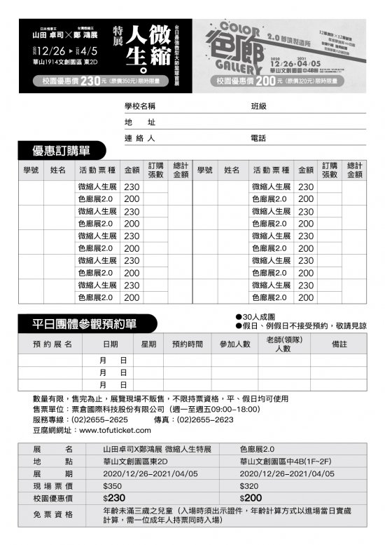 五、優惠早鳥票服務專線:(02)2655-2625傳真:(02)2655-2623