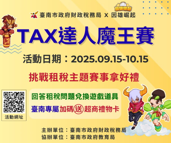 (一)登入方式:國中小學生、教職員以教育局之 OpenID 、教育雲或因材網帳號登錄,民眾以 Google 、 Line 帳號登入,「因雄崛起」線上學習平臺,至【Tax 達人魔王賽】挑戰,閱覽租稅教材,認識地方稅基本概念、統一發票兌獎多元服務措施及納稅者權利保護法等與生活相關稅務資訊,完成者依租稅答題積分排名獲得線上遊戲道具獎勵。
