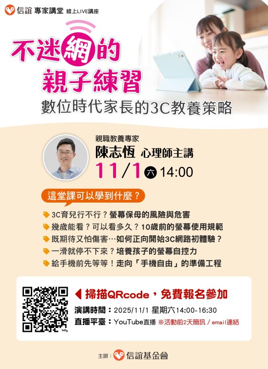 一、面對數位裝置普及、 AI 浪潮來襲,教養挑戰正不斷升級。 唯有從「家」出發,啟動正向 3C 教養策略,才能讓數位工 具成為孩子成長的助力,而非阻力。信誼將於 2025 年 11 月 1 日(六)下午 2 : 00-4 : 30 舉辦【不迷「網」的親子練習 :數位時代家長的 3C 教養策略】線上 LIVE 講座,邀請家 長免費報名參加。