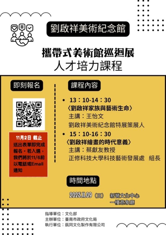 一、《劉啟祥美術紀念館-攜帶式美術館巡迴展人才培力課程 》邀請劉啟祥美術紀念館特展策展人王怡文、正修科技大 學藝術發展處教授蔡獻友,分享劉啟祥家族遷臺始末、耕 耘南臺灣藝術教育的精彩歷程,以及認識劉啟祥人物畫、 風景畫和其背後時代精神。