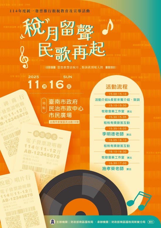 三、電子字幕宣導內容:新營國稅局於 11/16 (日)下午 3 時~5 時在新營民治市政中心市民廣場舉辦「稅月留聲~民歌再 起」統一發票宣導活動。當天現場有民歌手施孝榮、李明 德等陪您唱出青春記憶,還有捐發票換好禮及覓稅闖關等 活動,請至南區國稅局官方網站查詢。