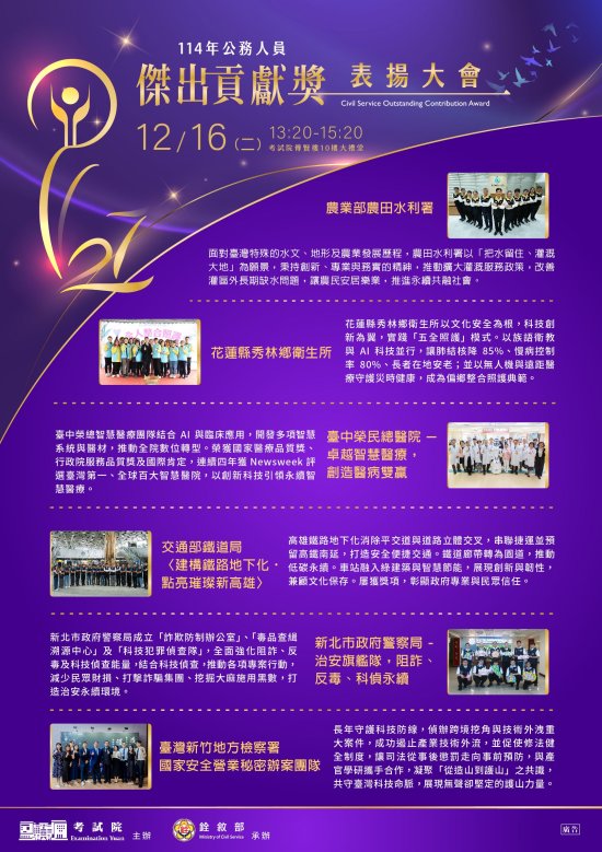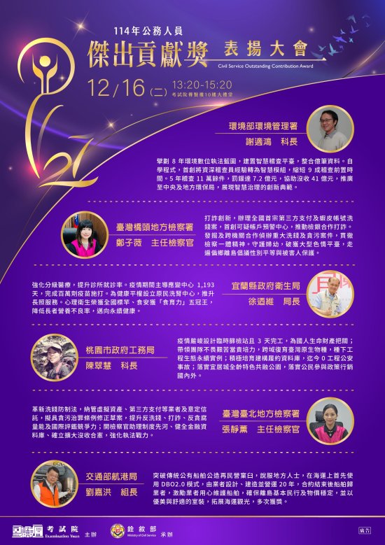 114 年公務人員傑出貢獻獎業經考試院組成評審委員會議,決議 6 名得獎人及 6 組得獎團體,如電子海報,歡迎自行下載運用