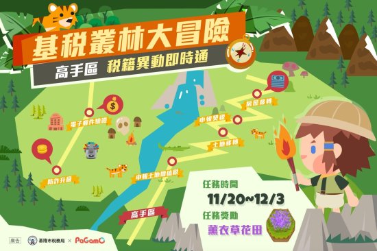四、活動辦法:在活動期間內登入 PaGamO 線上學習平台,至任務書點選「世界任務」,選擇「基稅叢林大冒險-高手區」任務書,完成第二階段可獲得薰衣草花田作為任務獎勵,以 Open ID 登入之基隆市公私立國小、國中生,前 150 名完成「基稅叢林大冒險-高手區」系列任務即可獲得超商商品卡 250 元。